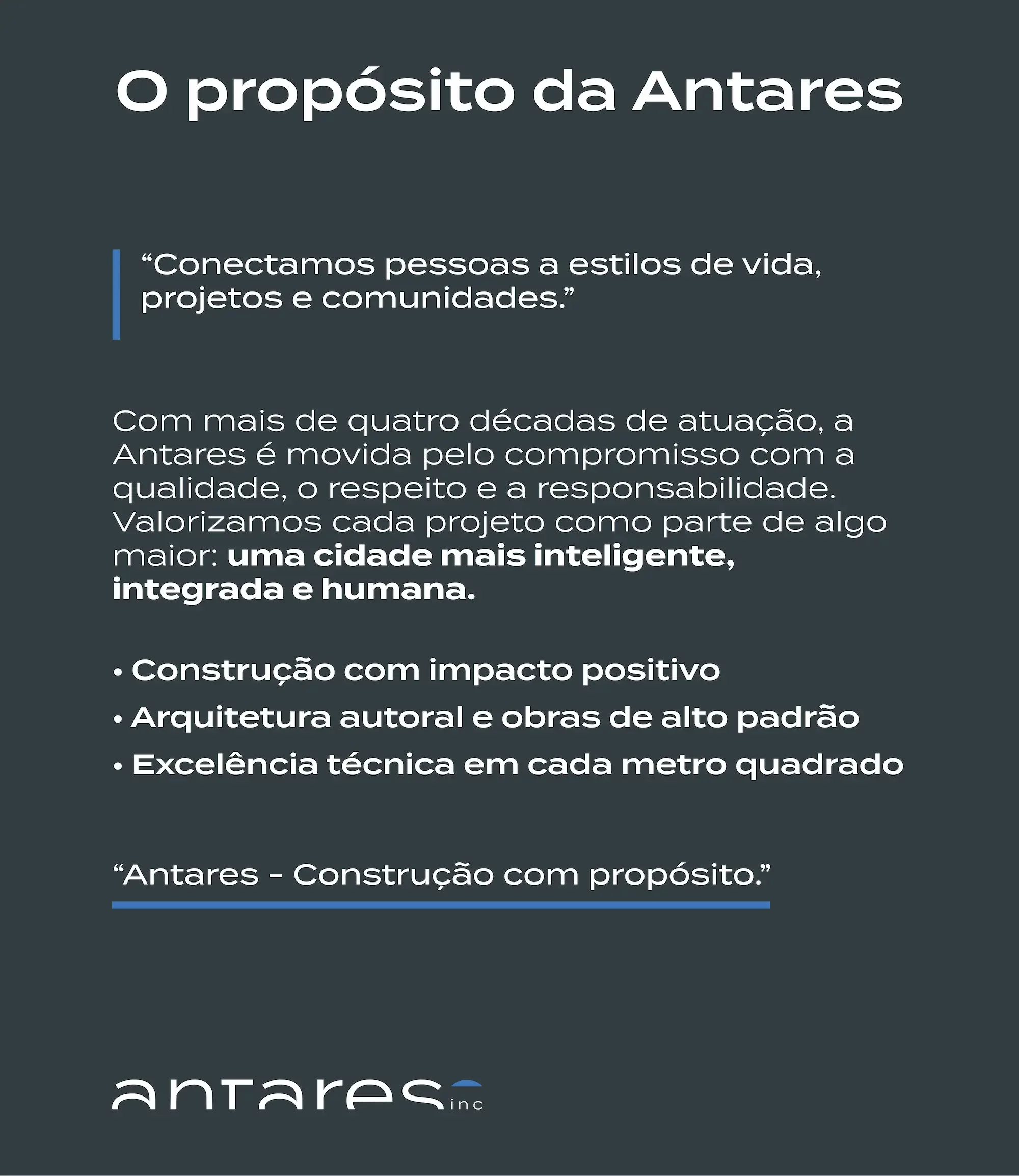 Na Antares, entendemos que cada imóvel é a concretização de um sonho, o resultado de um investimento cuidadosamente planejado. Por isso, trabalhamos comprometidamente para que cada metro quadrado construído supere as expectativas, aliando excelência construtiva, inovação e valorização do investimento.