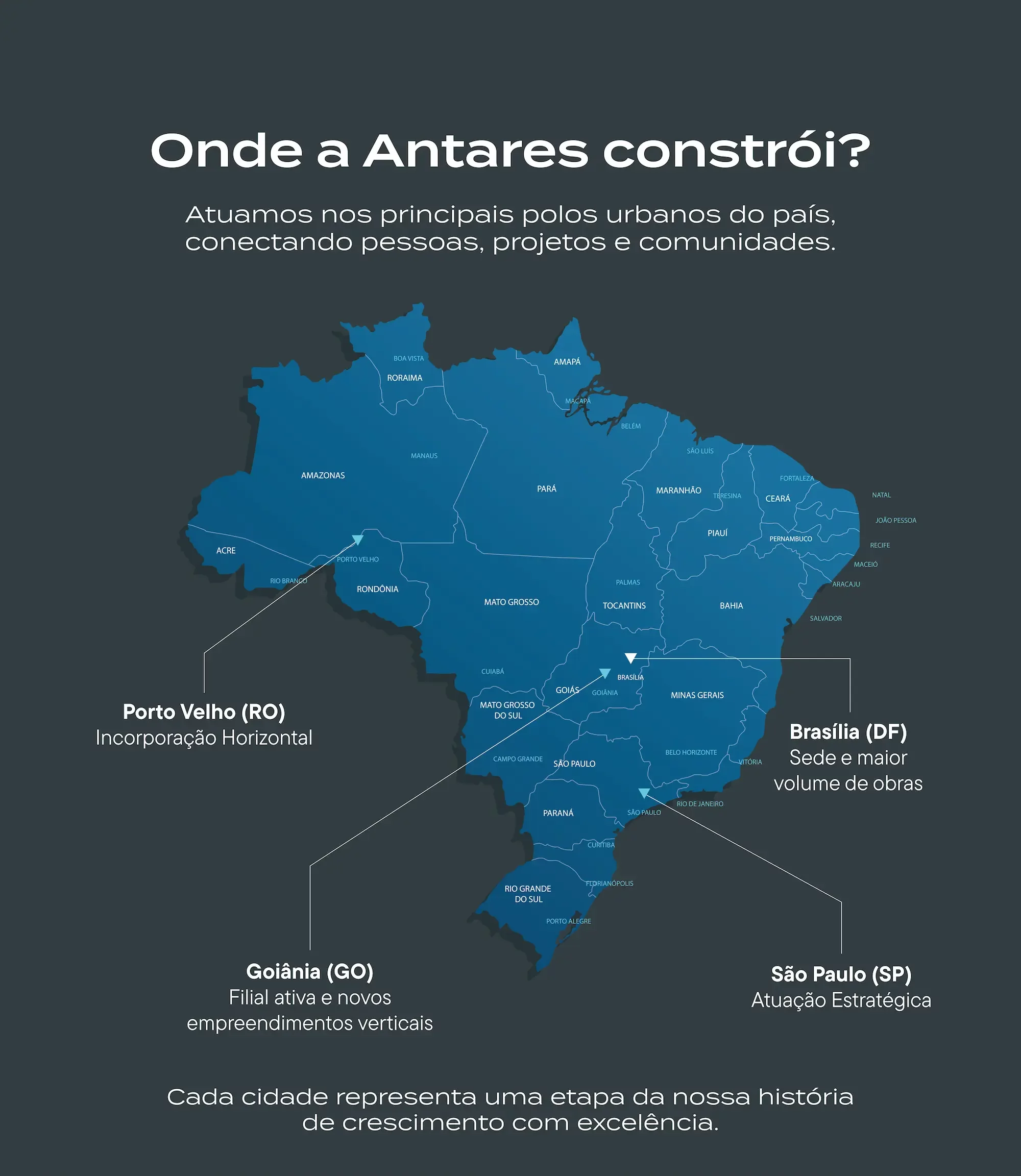 Há quatro décadas, a Antares parte de Brasília e escreve sua história de excelência, responsabilidade e inovação na construção civil. Agora estabelecida sua sede em Goiânia, a estrela do cerrado, a construtora é referência por seus empreendimentos de alto padrão, que aliam localizações privilegiadas, acabamentos de primeira linha e projetos arquitetônicos arrojados.